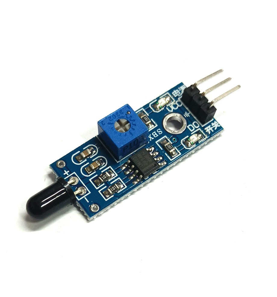 O sensor de chama/fogo é utilizado para detectar frequências de onda de 760nm até 1100nm, que são as produzidas por essas fontes de calor. Além disso, a detecção da chama se dá até 80cm de distância e o ângulo passível de identificação é até 60°C. A sensibilidade do sensor é ajustada por meio de um potenciômetro localizado no módulo e, este, por meio de suas saídas pode ser conectado ao microcontrolador. Quando o sensor está ativo (identificado um ponto de calor) ele fica em nível baixo (0), quando está em um ambiente normalizado fica em nível alto (1).